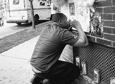 在19日至20日不到24小時的時間內(nèi),芝加哥發(fā)生數(shù)起槍擊案,導(dǎo)致至少3人死亡,約30人受傷。圖為9月20日,在美國芝加哥,25歲的槍擊案遇難者魯賓·奧斯汀的朋友在案發(fā)地點寫下悼念詞。新華社發(fā)