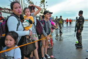 12日,塔克洛班市的災(zāi)民等候貨運(yùn)飛機(jī)送他們離開災(zāi)區(qū)。