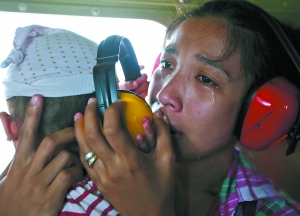 11日,吉萬(wàn)一名母親在登上救援的直升機(jī)后激動(dòng)落淚。