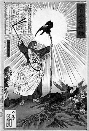 這幅《神武天皇東征》是明治時期的浮世繪畫師月岡芳年描繪《日本書紀》中神武東征的場面。畫面中,神武天皇拿著巨大的弓,上面立著金鵄,在神的光輝照耀下,天皇擊敗了敵兵。此畫于1876年刊行。