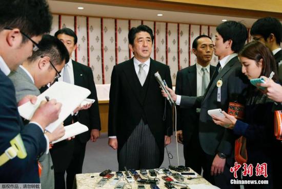 資料圖:2013年12月26日,日本東京,日本首相安倍晉三在迎來12月26日執(zhí)政一周年之際,參拜靖國神社。圖為安倍晉三接受采訪。