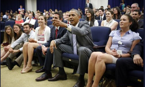 2014年7月1日,美國(guó)總統(tǒng)奧巴馬在艾森豪威爾行政辦公室與員工一起看美國(guó)和比利時(shí)之間的世界杯足球賽。
