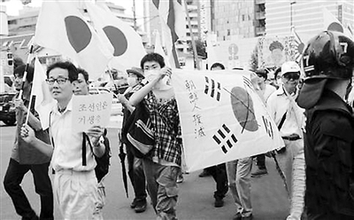 日本右翼團體也不甘落后。4月20日,日本右翼團體成員在東京市中心游行。游行中出現(xiàn)了被涂鴉破壞的太極旗,還在樸槿惠和慰安婦相片上寫著“乞丐、賣淫女”。
