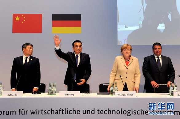 10月10日,中國國務(wù)院總理李克強(qiáng)在柏林與德國總理默克爾共同出席第七屆中德經(jīng)濟(jì)技術(shù)合作論壇并發(fā)表題為《在開放中再續(xù)合作黃金季》的演講。新華社記者 饒愛民 攝