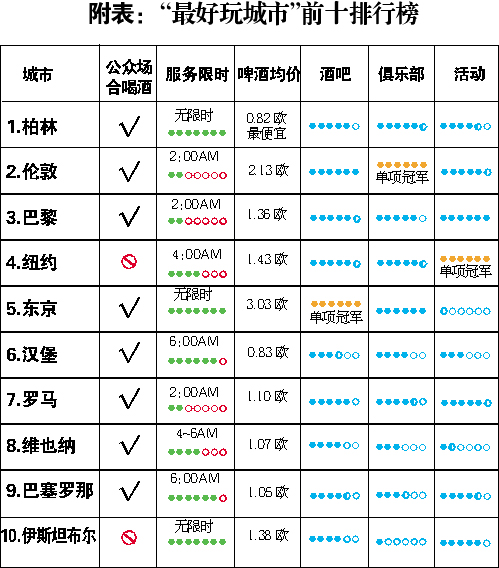柏林因?yàn)楸阋说钠【坪筒幌迺r(shí)的服務(wù)時(shí)間而獲此殊榮,而倫敦則被公認(rèn)擁有最棒的俱樂部和音樂會(huì)。