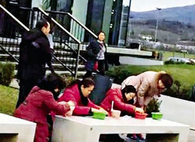 數(shù)名大媽寒天中蹲在Gucci名店前的石椅上吃泡面。(圖片來源網(wǎng)絡)