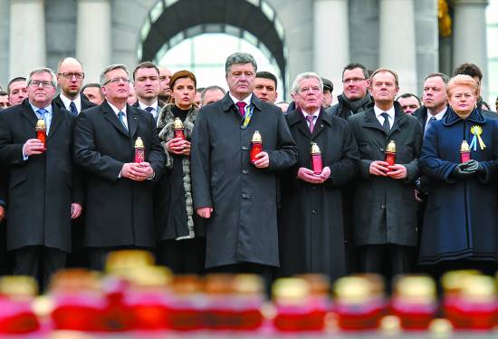 2月22日,烏克蘭首都基輔,烏克蘭總統(tǒng)波羅申科、波蘭總統(tǒng)莫羅夫斯基、德國(guó)總統(tǒng)高克等參加“尊嚴(yán)游行”,紀(jì)念烏政權(quán)更迭一周年。CFP供圖