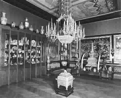 1860年英法聯(lián)軍劫掠焚毀圓明園后,侵華法軍司令孟托邦把從圓明園的劫掠所得獻(xiàn)給拿破侖三世(拿破侖弟弟的兒子)。為了存放這些文物,由歐仁妮皇后主持建造中國館,收藏有來自圓明園的金銀首飾、瓷器、香爐、編鐘、寶石、金銀器等3萬多件。