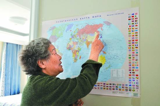 4月19日,姜淑媛在自己家中接受采訪時,在俄文世界地圖上向記者指點(diǎn)她曾生活過的俄羅斯遠(yuǎn)東哈巴羅夫斯克地區(qū)。實(shí)習(xí)生 周智宇/攝