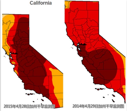 加州2014年4月29日與2015年4月28日干旱情況對(duì)照表。(干旱程度以顏色深淺分為5個(gè)等級(jí):反常干旱、中等干旱、嚴(yán)重干旱、超常干旱和最高等級(jí)干旱。)