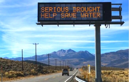 加州公路上的電子廣告牌號(hào)召民眾節(jié)水“嚴(yán)重干旱 幫助節(jié)約用水”(人民網(wǎng) 韓莎莎攝)