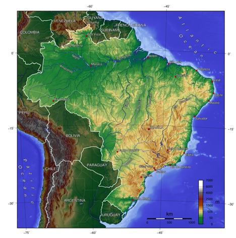 巴西國土位于南美洲東南部,東臨大西洋,北部是廣闊的亞馬遜雨林,南部地區(qū)多丘陵,大部分人口居住于此,是農(nóng)業(yè)基地。大西洋沿岸有數(shù)條山脈,海拔較高。境內(nèi)亞馬遜河是世界上流量最大的河流。全境大部分為熱帶氣候,亞馬孫平原為赤道多雨氣候,高原為熱帶干濕季氣候,最南部為亞熱帶濕潤氣候。