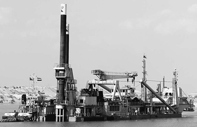 一艘作業(yè)船正在埃及新運河建設(shè)現(xiàn)場施工。