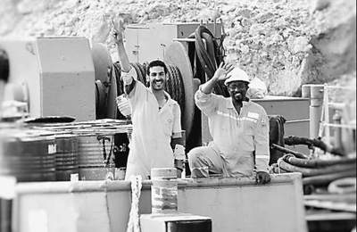 正在施工的埃及工人向參觀新運河的人們揮手致意。