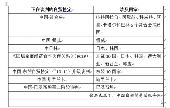 “中國對外商談自由貿(mào)易協(xié)定總體情況”還顯示,我國正在談判的自貿(mào)協(xié)定7個,涉及22個國家,分別是中國與海灣合作委員會(GCC)、澳大利亞、斯里蘭卡和挪威的自貿(mào)協(xié)定,以及中日韓自貿(mào)協(xié)定、《區(qū)域全面經(jīng)濟合作伙伴關系》(RCEP)協(xié)定和中國-東盟自貿(mào)協(xié)定(“10+1”)升級談判、中國-巴基斯坦自貿(mào)協(xié)定第二階段談判。