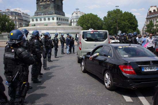 法國(guó)巴黎的出租車司機(jī)與優(yōu)步(Uber)專車司機(jī)16日發(fā)生沖突,出租車司機(jī)向?qū)\囃稊S石塊,最后防暴警察出動(dòng)才得以制止事端。