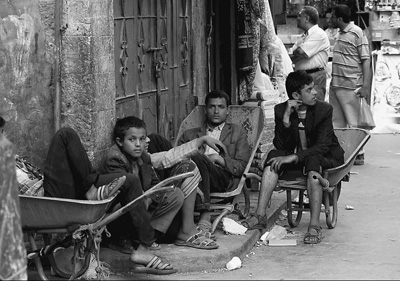 當(dāng)?shù)貢r間5月14日,也門進入5天人道主義;,民眾暫享平靜生活。圖為也門薩那一個市場里,一些年輕人在獨輪車上休息。