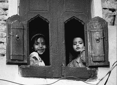 也門薩那兩位女孩在窗臺上展露笑顏。