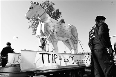 游行中抗議人員抬出了一個(gè)木馬。由于首字母相似,TTIP被反對(duì)者們直接稱為“特洛伊協(xié)定”(The Trojan Treaty)。