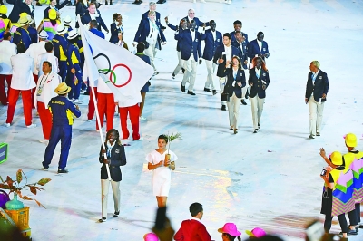 8月5日,第31屆夏季奧林匹克運(yùn)動(dòng)會(huì)開幕式在巴西里約熱內(nèi)盧馬拉卡納體育場舉行。圖為難民奧林匹克代表團(tuán)在開幕式上入場。新華社記者 呂小煒攝
