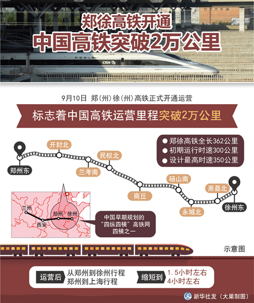 9月10日,鄭徐高鐵開(kāi)通。中國(guó)高鐵里程突破2萬(wàn)公里。新華社發(fā) 大巢制圖