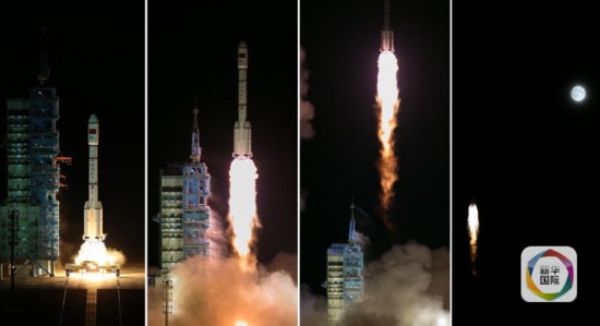 圖為2016年9月15日,中國在酒泉衛(wèi)星發(fā)射中心用長征二號F T2火箭將天宮二號空間實驗室發(fā)射升空(拼版照片)。(新華社記者琚振華攝)
