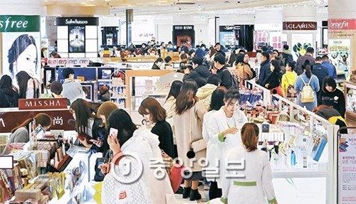 圖為1月5日,中國(guó)游客正在首爾蠶室樂(lè)天百貨店世界塔店內(nèi)挑選商品。(韓國(guó)《中央日?qǐng)?bào)》)