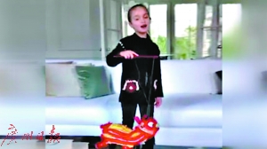 視頻中阿拉貝拉一邊玩著舞獅燈籠,一邊用中文唱《新年好》。