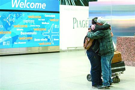 5日,曾被拒絕登機的也門男孩(左)抵達美國紐約肯尼迪機場后與父親擁抱。新華社/美聯(lián)