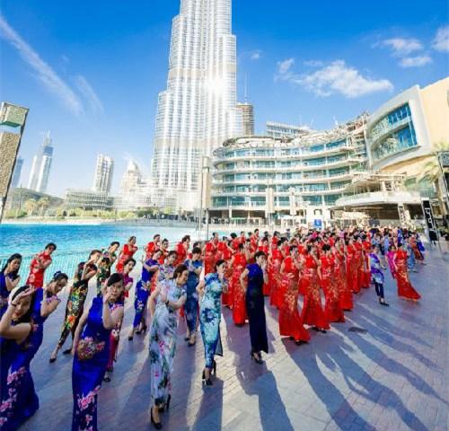 2017年1月15日,身著旗袍的快閃活動參與者在阿聯(lián)酋迪拜世界最高建筑——哈利法塔腳下表演。(新華社資料圖)