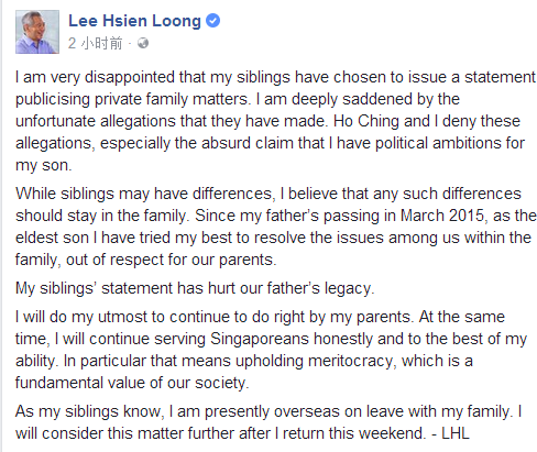 針對(duì)兩人的指控,李顯龍全然否認(rèn)。他說(shuō):“兄弟姐妹之間可能存在分歧,我認(rèn)為這些分歧應(yīng)該是只限在家庭里。自從我父親在 2015 年3月去世,出于對(duì)父母的尊重,身為長(zhǎng)子,我盡一切努力處理我們家人之間的紛爭(zhēng)。我弟弟妹妹的公開(kāi)信傷害了父親的名譽(yù)。我會(huì)繼續(xù)盡我全力無(wú)愧于父母,與此同時(shí),也會(huì)繼續(xù)竭盡所能忠誠(chéng)地為新加坡服務(wù),特別是堅(jiān)持唯才是用,而這是我們社會(huì)的基本價(jià)值觀。我的弟弟妹妹們都知道我和家人在國(guó)外度假,這個(gè)周末回國(guó)后我會(huì)考慮后續(xù)的處理!