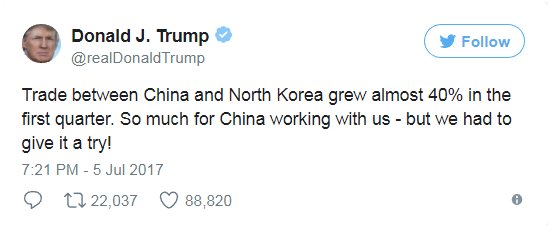 【環(huán)球網(wǎng)綜合報道】“中國與朝鮮的貿易在今年第一季度增加了將近40%。中國就是這樣跟我們合作。但我們不得不試試看!”這是美國總統(tǒng)特朗普5日在自己的推特賬號上發(fā)布的一段話,這兩天吸引了很多關注。然而,特朗普說的是事實么?澳大利亞媒體《悉尼先驅晨報》很快做出了一個有些“打臉”的回應:自從中國停止從朝鮮購買煤炭后,上個月中國從朝鮮的進口下滑了三分之一。
