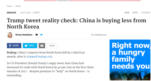 《悉尼先驅晨報》6日發(fā)表了一篇題為《特朗普推特的事實核查:中國從朝鮮進口得更少了》的報道。文章稱,特朗普那條“憤怒的推特”是具有誤導性的。中國在今年2月19日強化了從朝鮮進口煤炭的禁令,從即日起中國就完全停止了從朝鮮購買煤炭。此前,煤炭出口一直是朝鮮最大的外匯來源項目,據(jù)聯(lián)合國出具的報告,去年朝鮮總計出口了價值7.61億美元的煤炭。