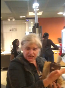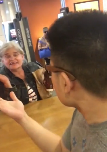 最終,罵人的老太太轉(zhuǎn)過(guò)身來(lái),直接對(duì)著相機(jī)。她不停揮舞著手,喊道:“嗨!我是美國(guó)人。我有權(quán)在這里用餐。你們快挪開(kāi)屁股,”她大聲大叫,指著沈思文。