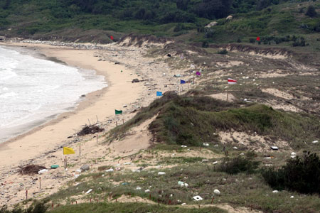 金門現(xiàn)有列管雷區(qū)一百五十三處,埋設(shè)地雷約七萬余枚。圖為金門山后海灘編號(hào)231-020雷區(qū)。