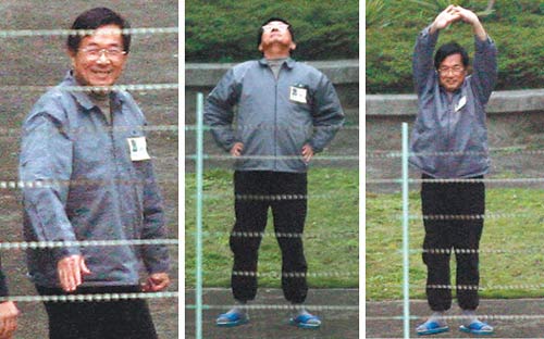 12日下午,陳水扁在臺(tái)北看守所放風(fēng)運(yùn)動(dòng),他雙手叉腰,身體向后伸展,還沖著在附近大樓樓頂守候的記者笑,好像要擺姿勢給記者拍照。