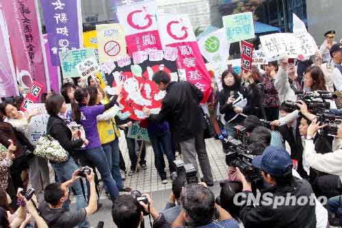 11月26日,臺(tái)灣數(shù)10個(gè)社會(huì)團(tuán)體到臺(tái)北壹傳媒大樓,抗議該媒體推出的“動(dòng)新聞”內(nèi)容涉及膻色腥、暴力和有侵犯隱私之嫌,臺(tái)北市政府和臺(tái)灣有關(guān)方面也正陸續(xù)出臺(tái)處罰措施。(圖片來源:中新社)