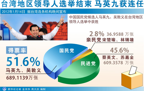 2012年1月14日 圖表:臺(tái)灣地區(qū)領(lǐng)導(dǎo)人選舉結(jié)束 馬英九獲連任 新華社記者 金良快 周大慶 編制