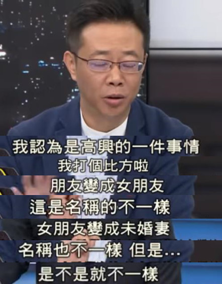 臺(tái)灣政論節(jié)目《少康戰(zhàn)情室》中,民進(jìn)黨“立委”張宏陸就此事欣喜表示,這次改名字是個(gè)高興事兒。為了論證自己的結(jié)論,張進(jìn)行了這樣一番闡述:你看,朋友變女朋友,名稱不一樣!女朋友變未婚妻,名稱也不一樣!是不是親密度就不一樣了!