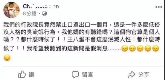疫情發(fā)生后,曾經(jīng)宣稱要“拿掃把跟大陸戰(zhàn)斗到底”的蘇貞昌第一個跳出來發(fā)難。他早早宣布,從大年三十(1月24日)起,停止全臺口罩出口一個月。