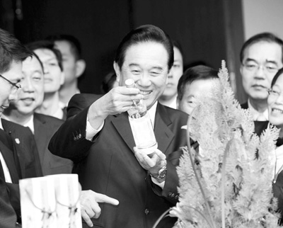 2月26日,陳云林參觀云林縣特產(chǎn)時(shí),對(duì)名為“福祿壽”的白酒產(chǎn)生興趣。(中新社發(fā))