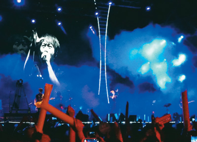 下午4時(shí)開(kāi)始就有表演,先是俄羅斯樂(lè)隊(duì)、歐洲樂(lè)隊(duì),隨后是北京的樂(lè)隊(duì)上場(chǎng)。晚8時(shí)音樂(lè)會(huì)正式開(kāi)場(chǎng),主持人喚出日本人氣樂(lè)隊(duì)“凡人譜”,最后是人氣爆棚的臺(tái)灣樂(lè)隊(duì)“五月天”壓軸演出。臺(tái)上歌手汗流浹背盡情嘶吼,重低音鼓點(diǎn)一下下猶如敲打著聽(tīng)眾胸腔,臺(tái)下跟著歡呼律動(dòng)漸入忘我之境……