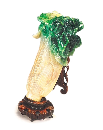 道光之后,清朝國力嚴重衰退,不但新疆的和田玉進貢完全停止,就連蘇州、揚州兩地的玉作坊也因兩次鴉片戰(zhàn)爭及太平天國起義而一蹶不振。但是由于西南貨運之路未斷以及慈禧太后對翡翠極度癡迷,翡翠在清朝晚期呈現出全國性流行態(tài)勢,從朝野到市井莫不趨之若鶩。受時代環(huán)境的影響,此時的翡翠件多由粵海一帶所制,無論是造型、工藝都不同于乾嘉時期,已然完成了清雅陳設到實用佩戴的轉變。這一點,從臺北故宮玉器展館及清代家具展館所展出的簪釵、扁方、耳環(huán)、手串、手鐲、帽正、翎管、戒指上便可得到印證,這些首飾或單獨成器,或與珊瑚、碧璽、各色寶石、燒藍等混合鑲嵌,華美精巧,為我們再現了一幅晚清宮眷生活圖。值得一提的是,從首都博物館展出的李蓮英扳指(傳為慈禧所賜)、榮祿帶鉤等翡翠物件來看,晚清時期人們對于翡翠已經有了更深的認識和更高的審美追求,滿綠冰透的高貨成了這個時期達官貴人們的新寵。與以上兩件翡翠相比,同為晚清物件的臺北故宮翠玉白菜在玉質上顯然不及,但其雕刻神妙,白菜、螽斯和蟈蟈所寄意的“清白傳家”、“螽斯衍慶”也正貼合了尋常百姓佩戴、賞玩翡翠的心理需求。所以,從這一點來看,翠玉白菜成為臺灣民眾的心頭好也在情理之中。(胡穎華)