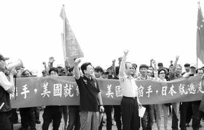 臺(tái)灣統(tǒng)派政治團(tuán)體振臂高呼“兩岸齊心,保衛(wèi)釣魚(yú)島”“兩岸聯(lián)手,美國(guó)就縮手,美國(guó)一縮手,日本就逃走”。 本報(bào)記者 徐 蕾攝