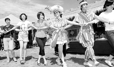 大陸游客與阿美族勇士(右二)同歡共舞,體驗(yàn)阿美族文化。