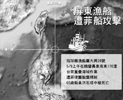 屏東小琉球籍的漁船“廣大興28號”9日在臺菲重疊經(jīng)濟(jì)海域作業(yè)時(shí),遭遇菲律賓公務(wù)船在沒有預(yù)警的情況下,以自動武器射擊數(shù)十槍,漁民洪石成不幸身亡。臺灣當(dāng)局官員指出,臺灣漁船當(dāng)時(shí)所在位置是臺菲暫定執(zhí)法線海域內(nèi)作業(yè),是臺灣合法漁場。