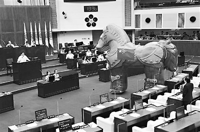 臺北市議會8月25日進(jìn)行市政總質(zhì)詢,一名民進(jìn)黨議員在現(xiàn)場擺上“大型塑料馬”,渲染大陸威脅。資料照片