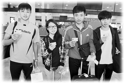 幾名來(lái)自臺(tái)北的青年學(xué)生在福建廈門(mén)五通碼頭展示電子臺(tái)胞證。姜克紅攝