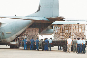 美軍軍用C130運(yùn)輸機(jī)載運(yùn)120卷軍用防水塑料布救災(zāi)物質(zhì) 臺(tái)灣聯(lián)合報(bào)圖