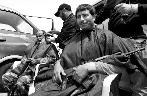 4月24日,利比亞艾季達(dá)比耶市,反對(duì)派武裝分子在戰(zhàn)斗之余修整頭發(fā)。